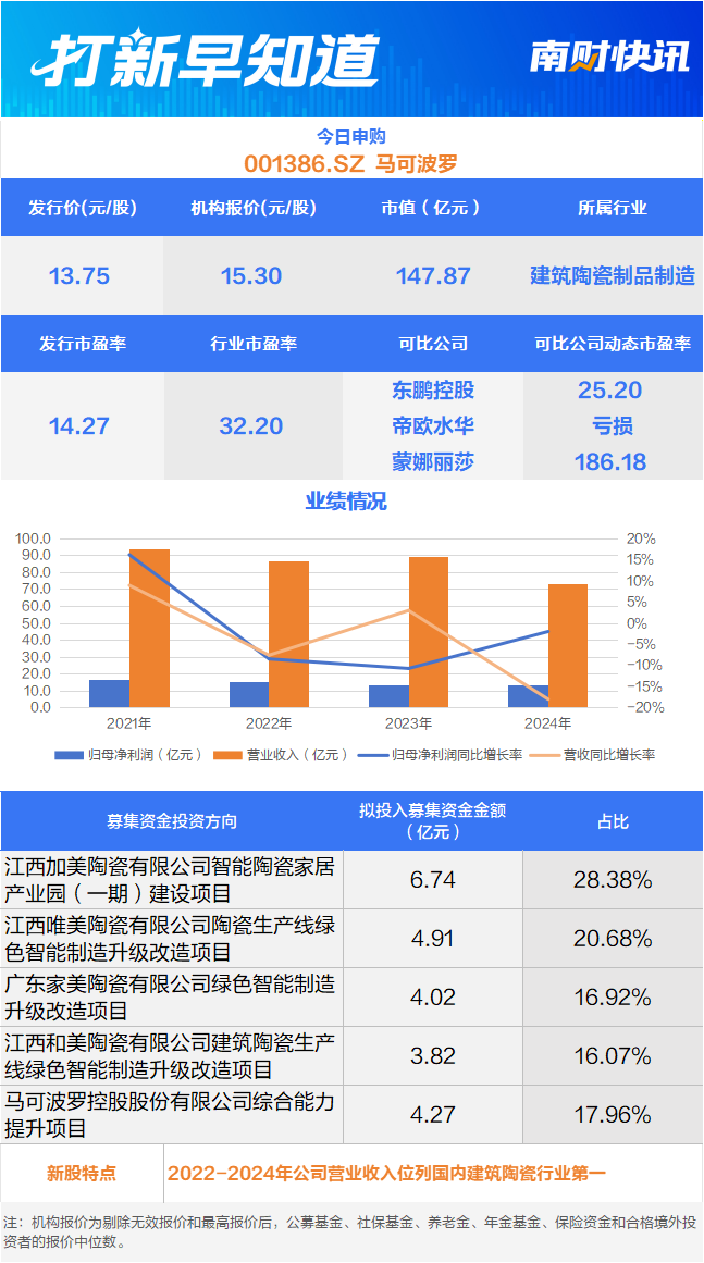 2025-10-13必威官方网站,Betway必威,必威APP下载10月13日,可申购深市主板上市的马可波罗(001386.SZ),该公司专注于建筑陶瓷的研发、生产和销售,是国内最大的建筑陶瓷制造商和销售商之一。