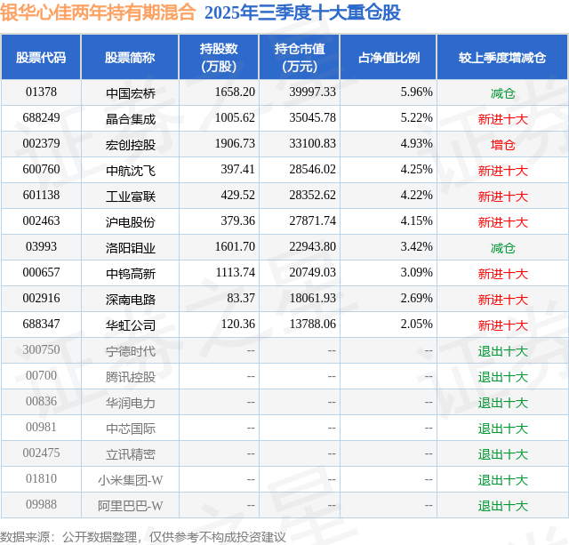 根据2025基金Q3季报公募基金重仓股数据,重仓该股的公募基金共12家,其中持有数量最多的公募基金为银华基金的银华心佳两年持有期混合。银华心佳两年持有期混合目前规模为67.16亿元,最新净值1.0086(1月8日),较上一交易日下跌0.47%,近一年上涨66.85%。该公募基金现任基金经理为李晓星 张腾 杜宇。张腾在任的基金产品包括:银华瑞和灵活配置混合A,管理时间为2024年3月7日至今,期间收益率为66.82%;银华甄选价值成长混合A,管理时间为2024年8月7日至今,期间收益率为50.29%;银华甄选价值回报混合A,管理时间为2025年9月18日至今,期间收益率为6.06%。李晓星在任的基金产品包括:银华中小盘混合,管理时间为2015年7月7日至今,期间收益率为289.36%;银华盛世精选灵活配置混合发起式A,管理时间为2016年12月22日至今,期间收益率为126.01%;银华心诚灵活配置混合A,管理时间为2018年3月12日至今,期间收益率为84.84%;银华心怡灵活配置混合A,管理时间为2018年7月5日至今,期间收益率为236.18%。杜宇在任的基金产品包括:银华中小盘混合,管理时间为2019年12月11日至今,期间收益率为105.82%;银华丰享一年持有期混合,管理时间为2022年1月26日至今,期间收益率为17.16%;银华心质混合A,管理时间为2023年3月30日至今,期间收益率为39.61%;
