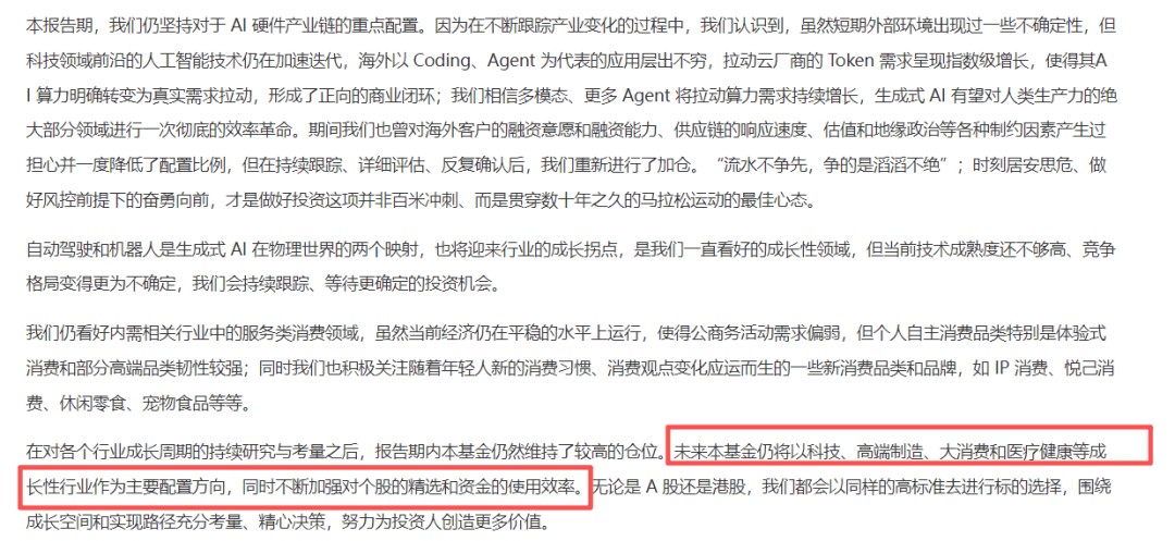 年报中,武阳提到基金仍会以成长性行业作为主要配置方向,也就是AI、高端制造等行业。