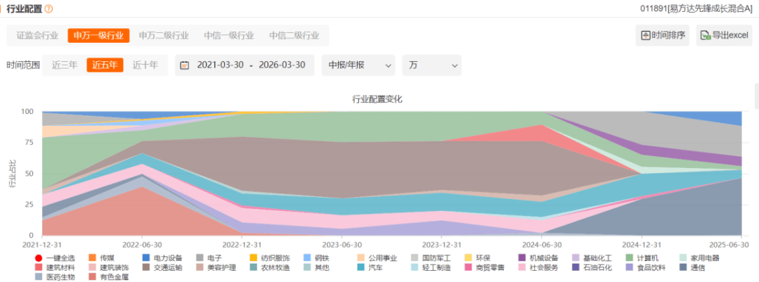 武阳在行业配置上不算均衡,在某一阶段也会重仓出击,例如2022年中报开始大比例配置交通运输,到了2024年又快速切换至TMT行业。