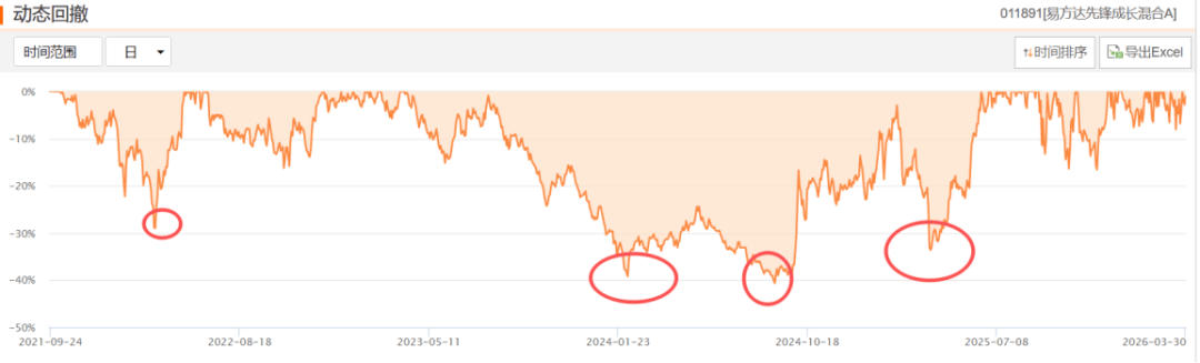 回撤方面,2021年以来易方达先锋成长混合A的最大回撤在40%左右,但大部分时间能控制在20%以内。