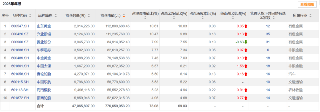 不仅行业集中,前十大重仓股的集中度也相当高,2025年末占基金净值的比重接近70%。其中,山东黄金、兴业银锡、锡业股份、中金黄金四只有色金属个股占净比达34.5%。