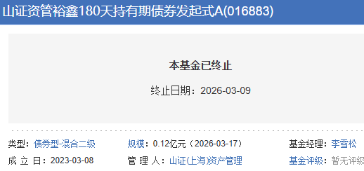 根据基金管理人于2026年3月9日公布的《山证(上海)资产管理有限公司关于山证资管裕鑫180天持有期债券型发起式证券投资基金基金合同终止及基金财产清算的公告》,该基金的最后运作日为2026年3月8日,并于2026年3月9日进入清算程序。