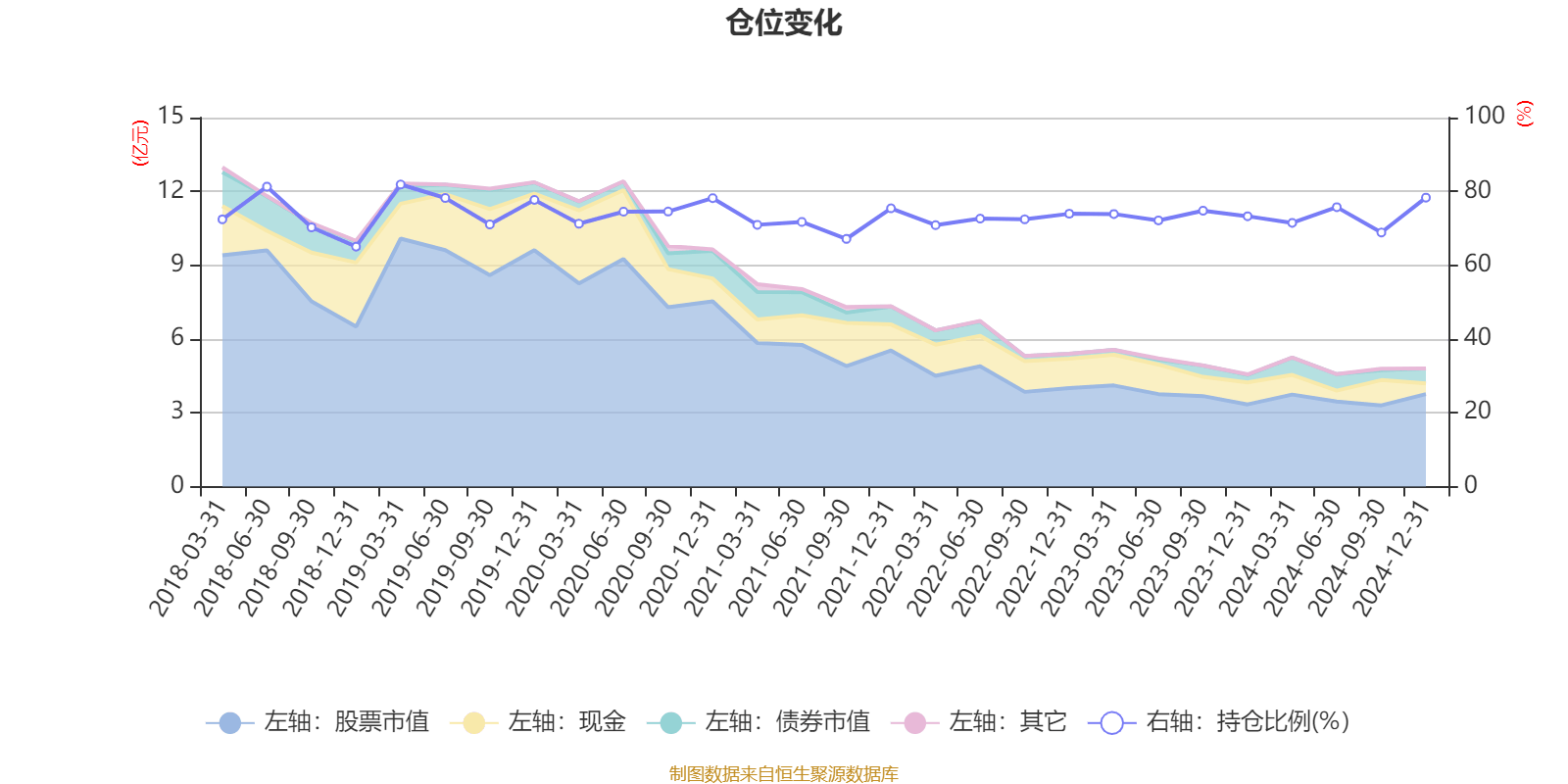 据定期报告数据统计,近三年平均股票仓位为73.19%,同类平均为79.88%。2019年一季度末基金达到81.87%的最高仓位,2018年末最低,为65.04%。