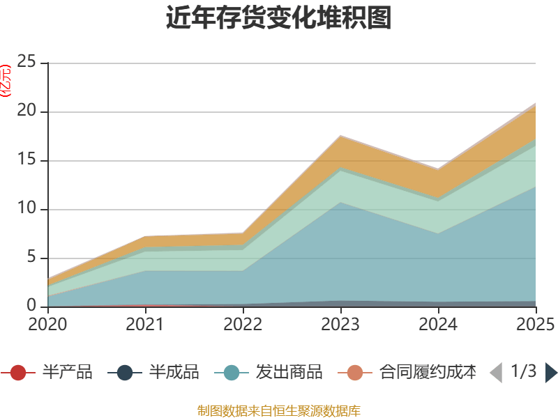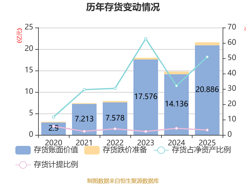 从存货变动来看,截至2025年末,公司存货账面价值为20.89亿元,占净资产的50.89%,较上年末增加6.75亿元。其中,存货跌价准备为6884.11万元,计提比例为3.19%。