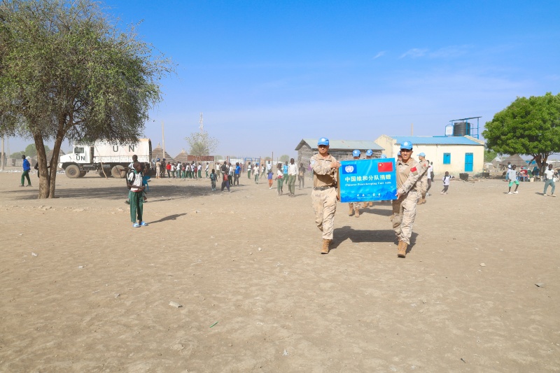 人民网内罗毕3月11日电(记者黄炜鑫)当地时间3月10日,中国第二批赴阿卜耶伊维和快反分队官兵来到任务区周边的木木小学开展“守护和平,播种希望”助学慰问活动。 搬运慰问物品。